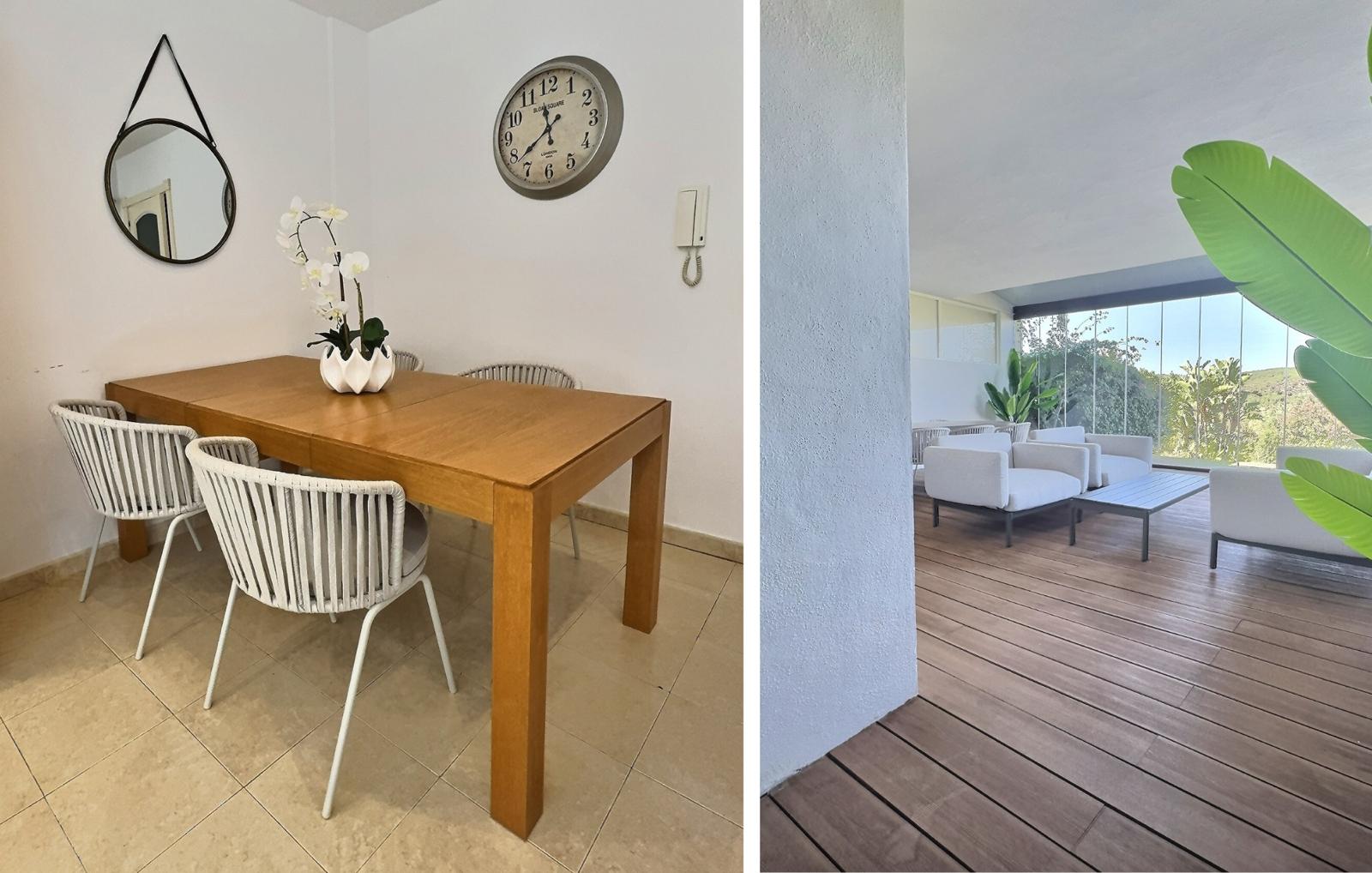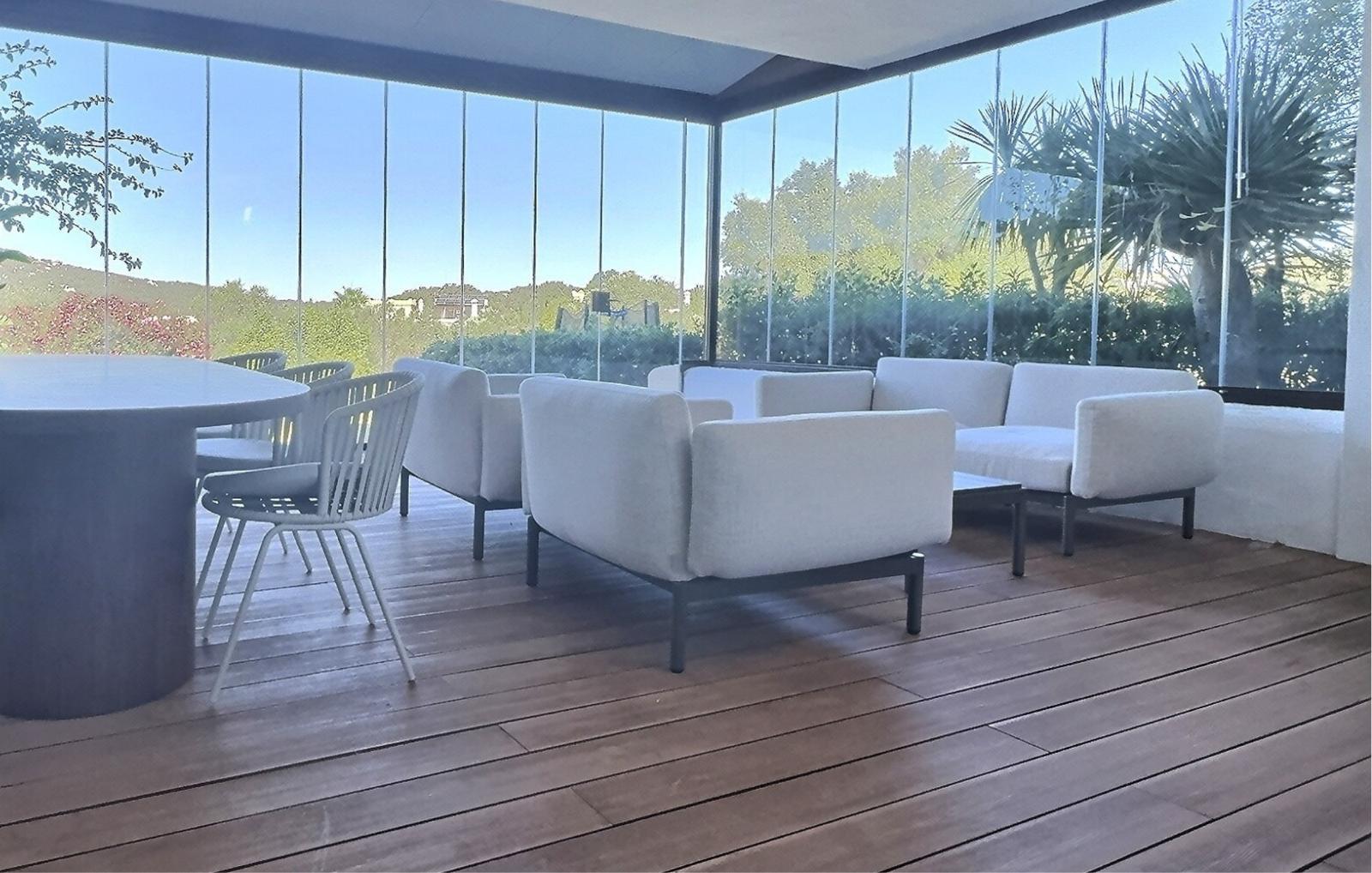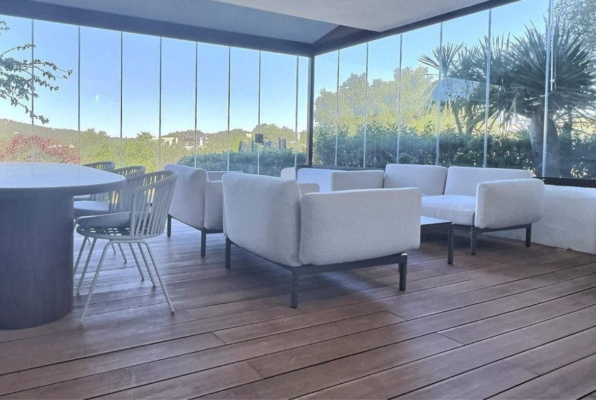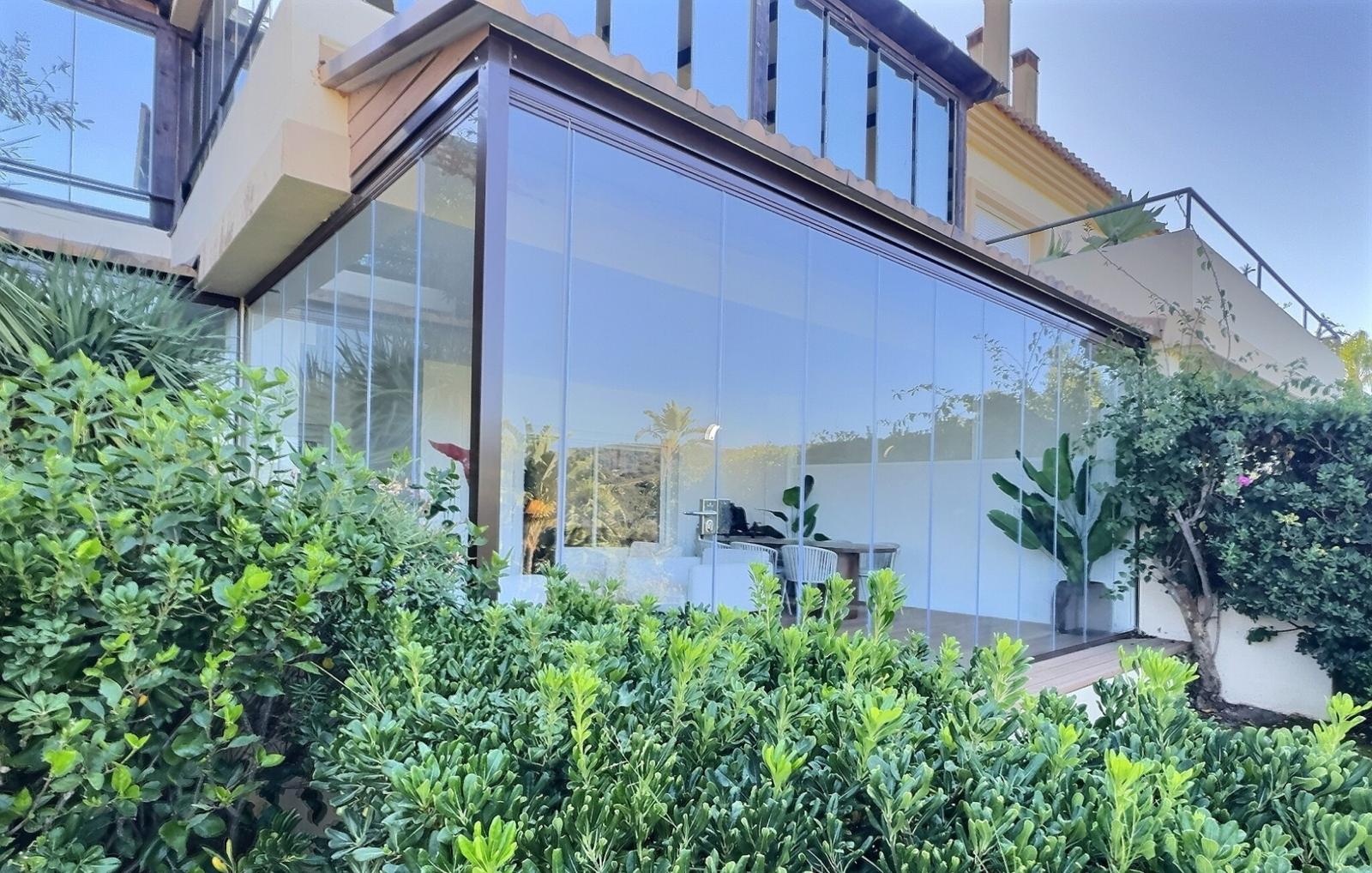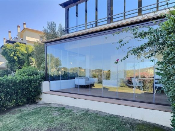 The home is bright and generously proportioned, featuring a spacious open-plan living and dining area with a charming fireplace and direct access to a large private terrace. The terrace is fitted with brand-new glass curtains, allowing you to enjoy the outdoor space all year round while still benefiting from uninterrupted garden and golf views.