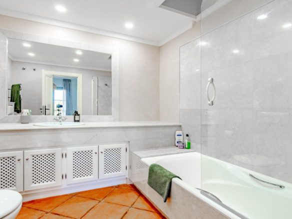 The west-facing orientation ensures glorious afternoon sun and stunning sunsets over the golf course. Step outside to discover over 50 m² of thoughtfully designed terracing, including a generous covered terrace ideal for alfresco dining and a private garden of approximately 60 m²—your own tranquil oasis with frontline golf views. The abundant outdoor space is perfectly suited to the Mediterranean climate, offering multiple areas for relaxation, dining, and entertaining throughout the year.