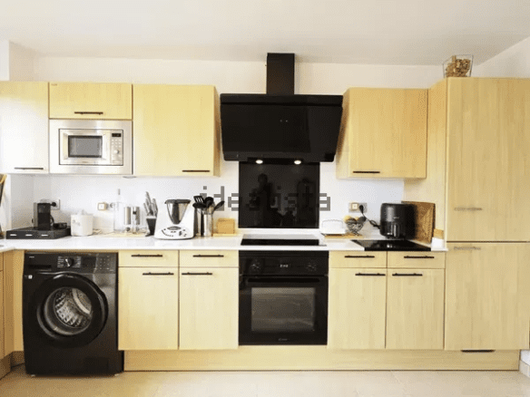 The apartment also includes two private garage spaces, one specially adapted for a golf buggy, as well as a large storage room, adding both convenience and functionality.